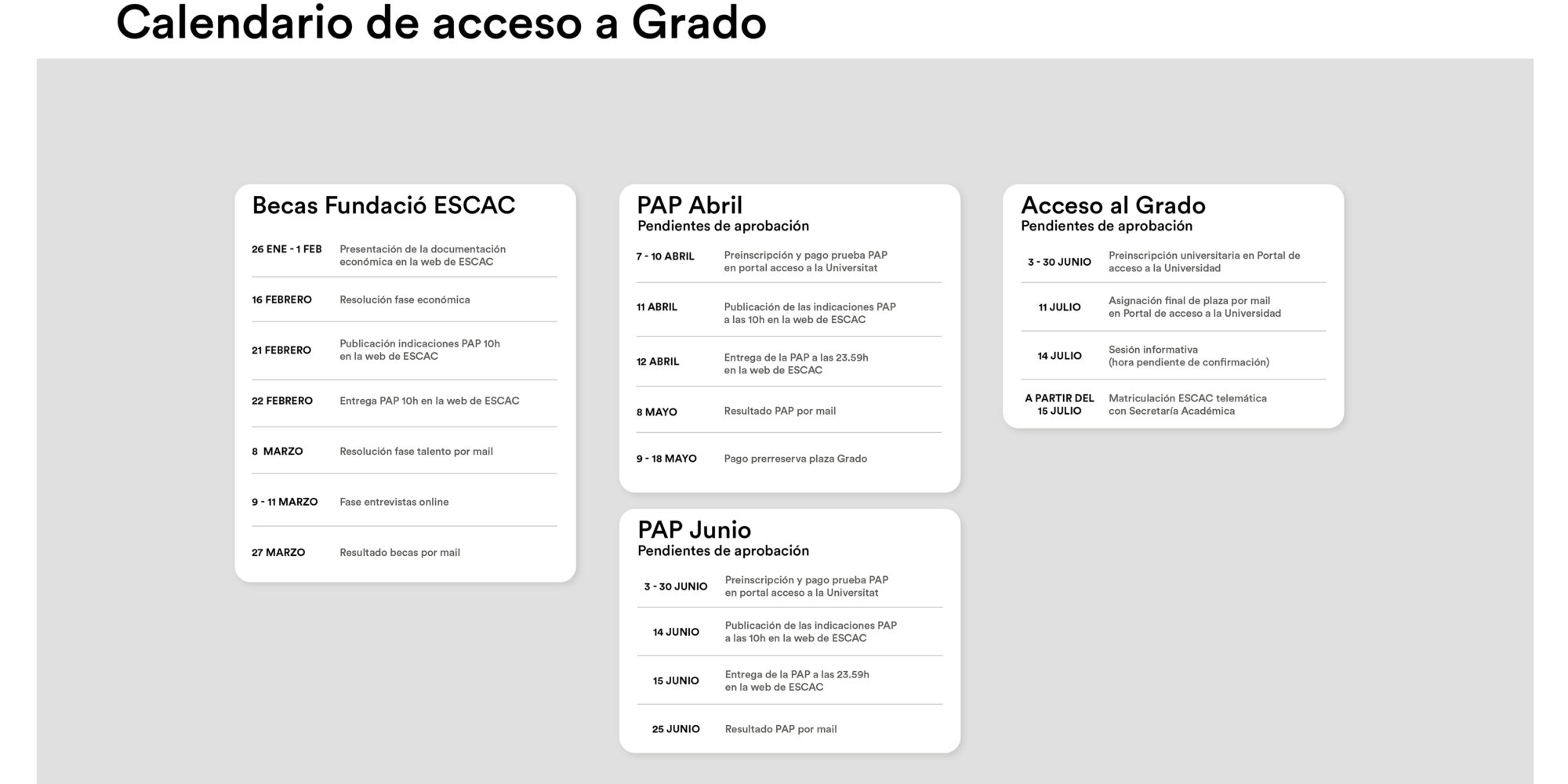 2. Preparació, entrega i resolució de la Prova PAP de ESCAC. La presentació de la PAP es fa a través d’un formulari electrònic en aquesta mateixa pàgina web. S’ha d’aportar els següents materials portafolio, prova audiovisual i videopitch, allotjats en carpetes mitjançant un enllaç URL. Les dates del curs 2026-2027 són les detallades a continuació: