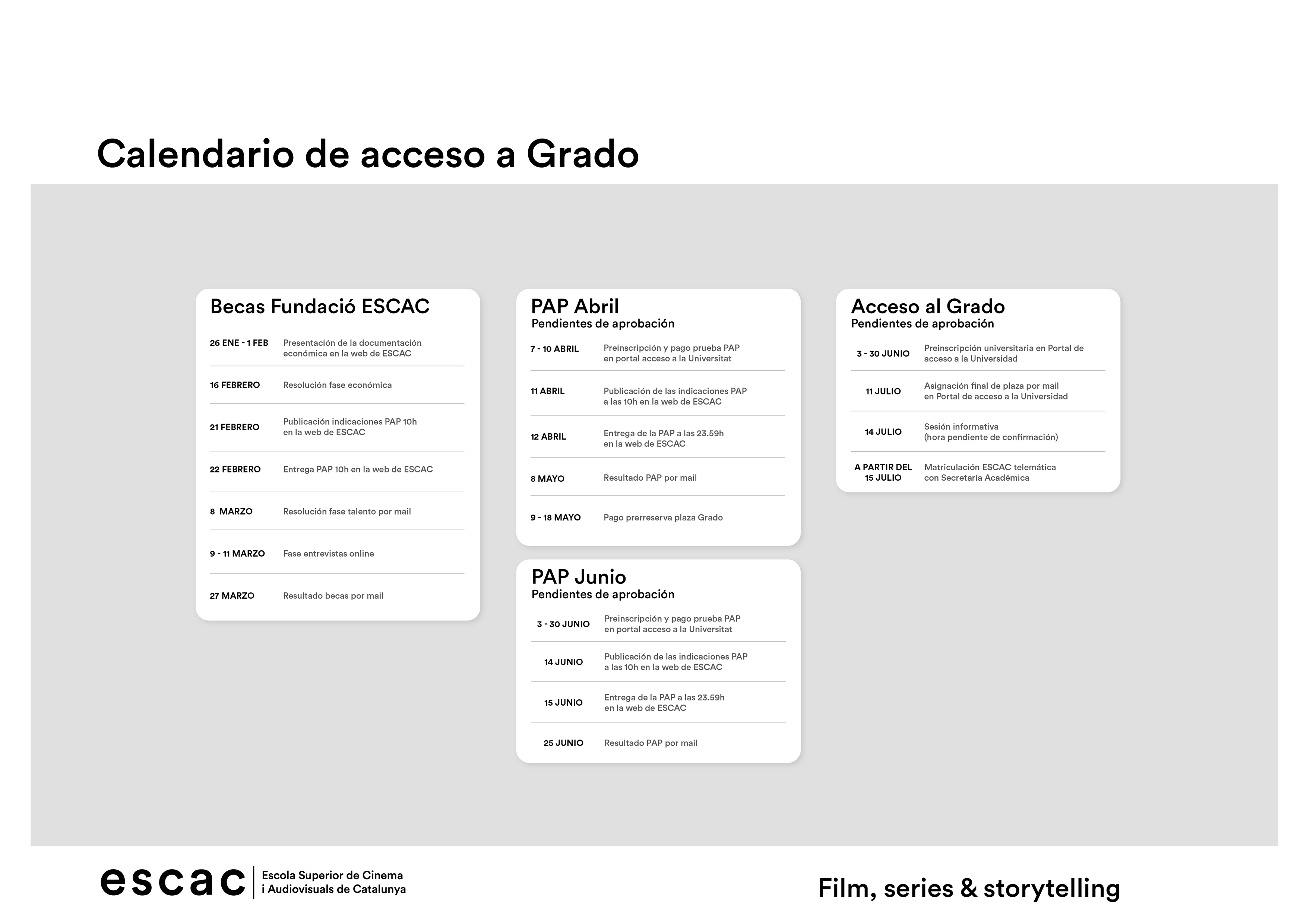 2. Preparació, entrega i resolució de la Prova PAP de ESCAC. La presentació de la PAP es fa a través d’un formulari electrònic en aquesta mateixa pàgina web. S’ha d’aportar els següents materials portafolio, prova audiovisual i videopitch, allotjats en carpetes mitjançant un enllaç URL. Les dates del curs 2026-2027 són les detallades a continuació: